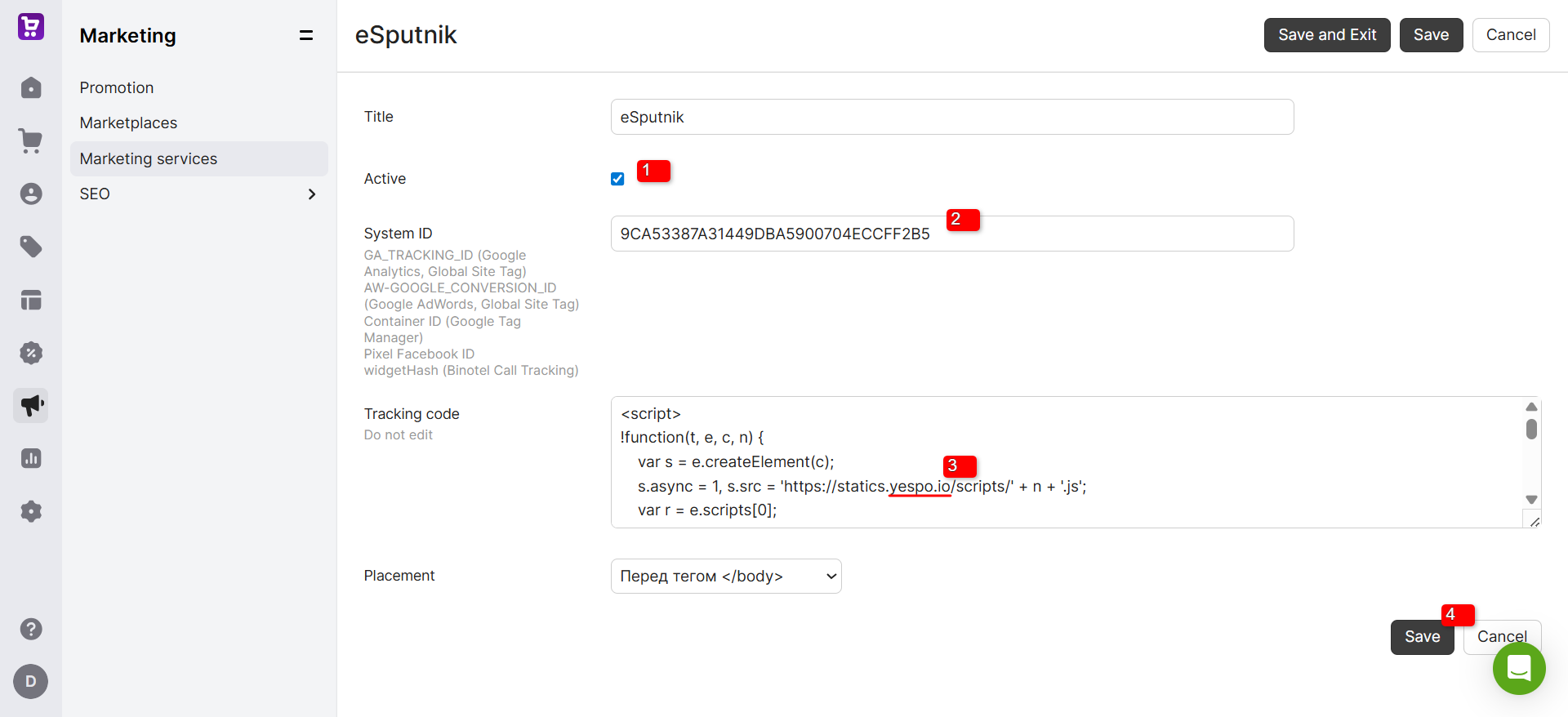 In your Horoshop account, go to the Marketing → Marketing services section, find and click to edit eSputnik.