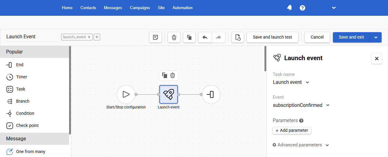 The task has one basic parameter — Message. In this field, select a pre-created message that will be sent to the user. The task also has advanced parameters.