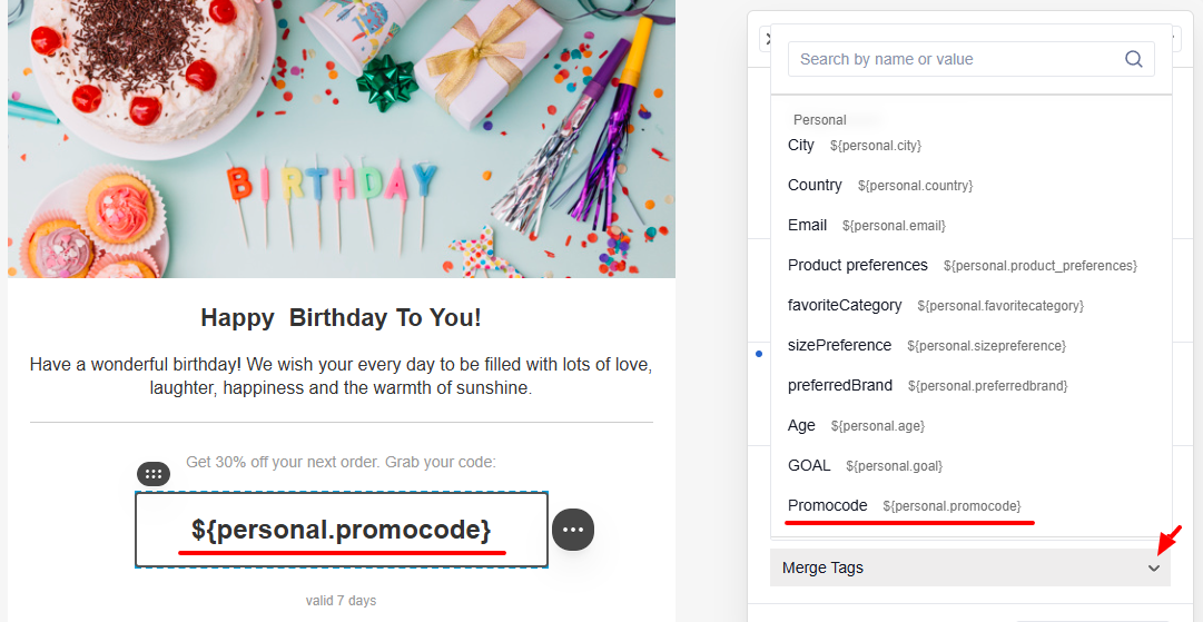 In the message template, click the place where you want to insert the promo code. In the Text block settings, open the Merge Tags section and select Promocode. The system will automatically insert the required variable.