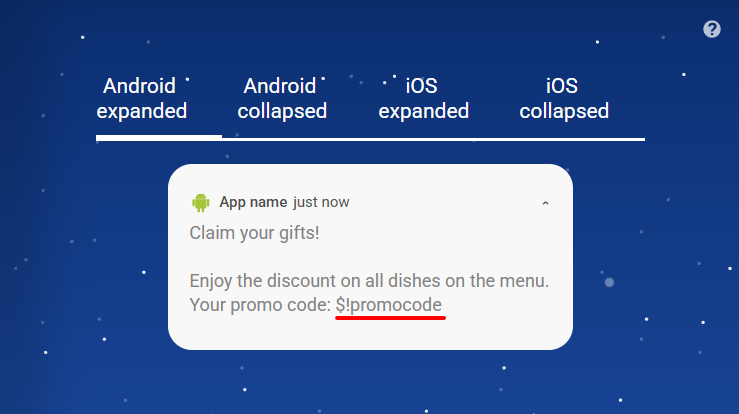 It is necessary to substitute variable $!promocode in the message on the place of promo code.