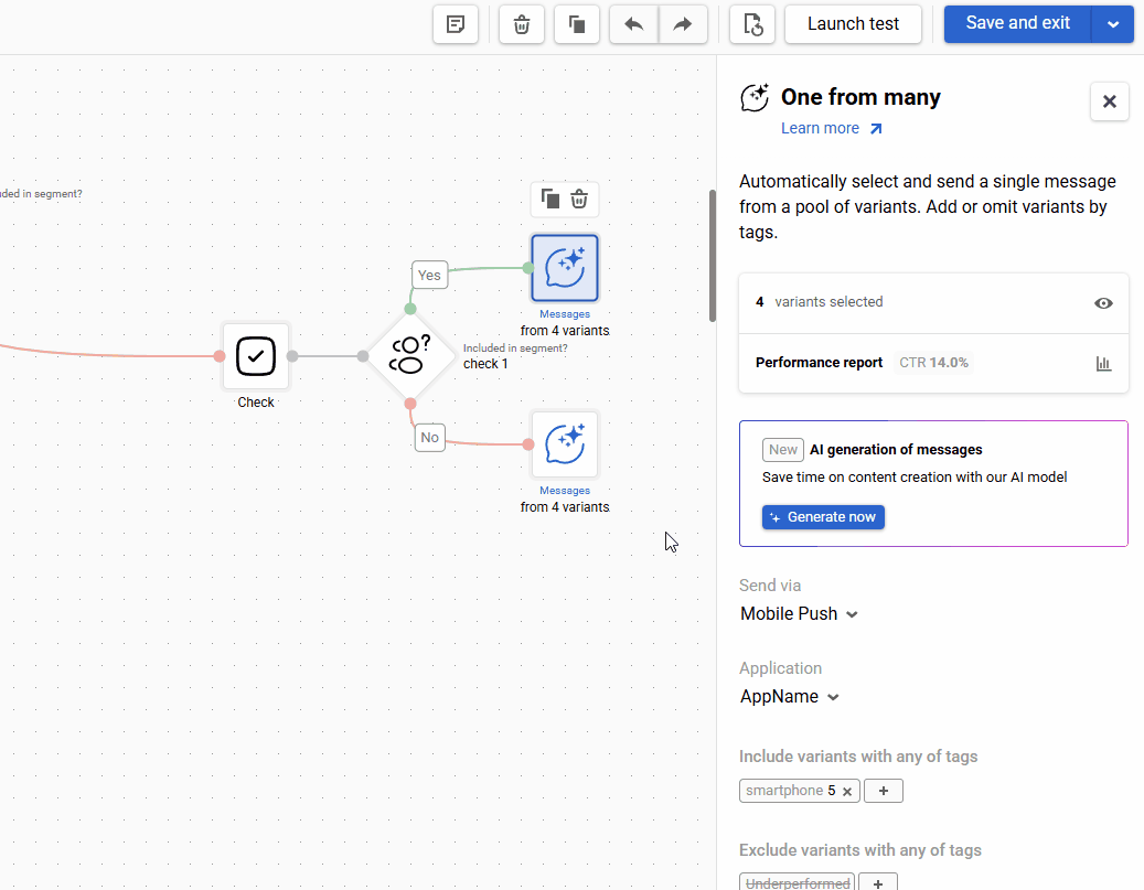 Underperformed is a system tag that is automatically assigned to message variants in the One from many block when their click-through rate is significantly lower than that of other variants in the pool. Variants with this tag are excluded from further automatic selection.