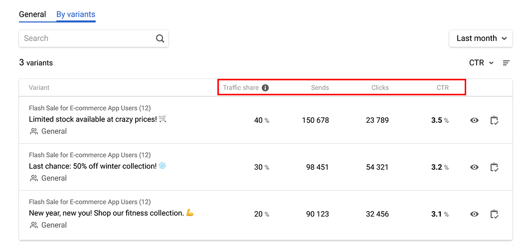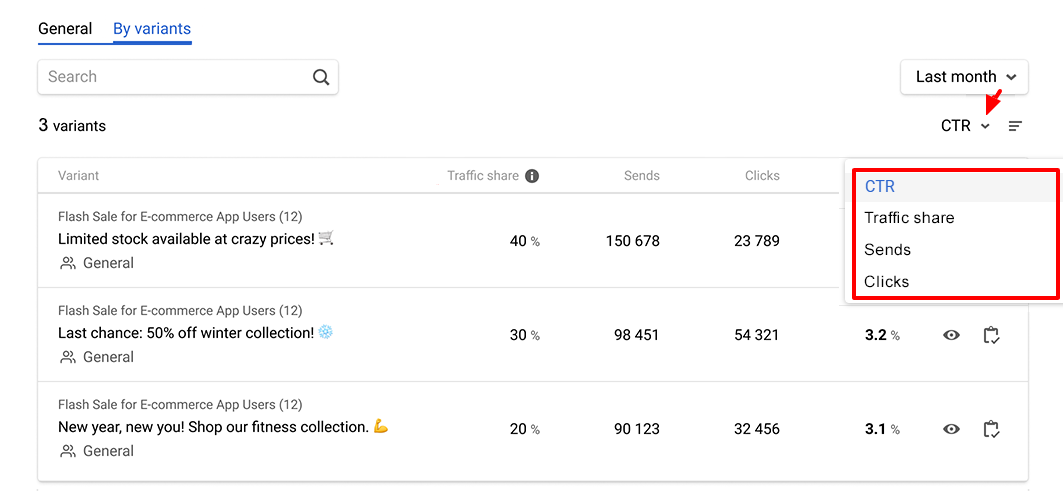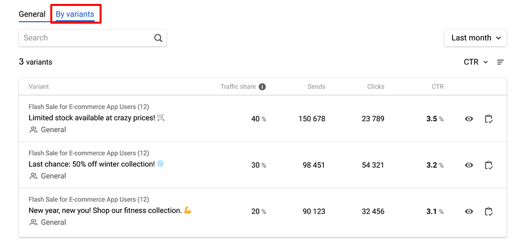 - By variants — shows detailed statistics for each message variant.
