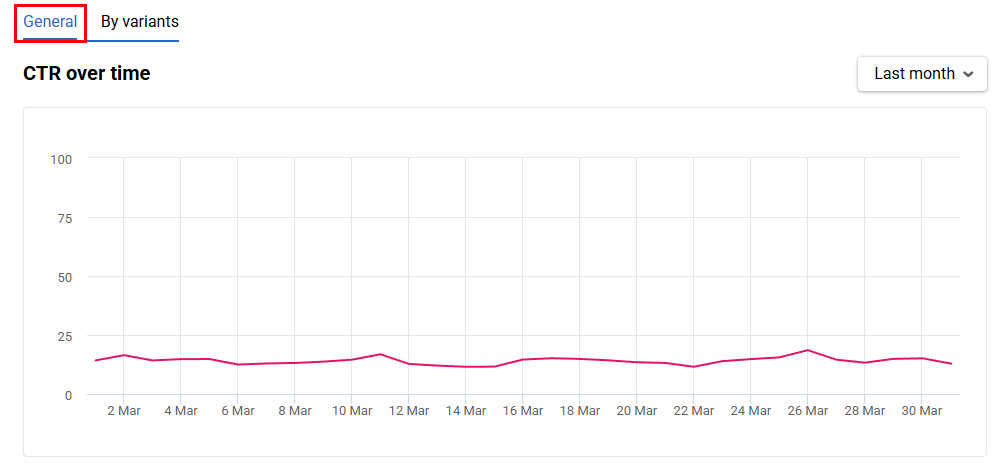 The aggregated CTR trend for all messages in the block is displayed in the block settings (Performance report). The system selects the Last month period by default.