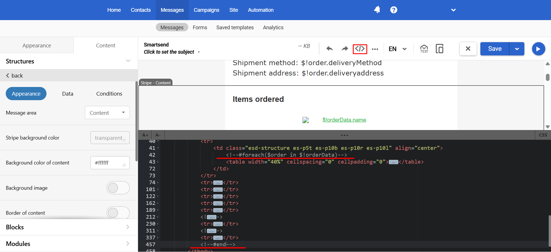 #endA prepared email containing velocity code has the following look:
