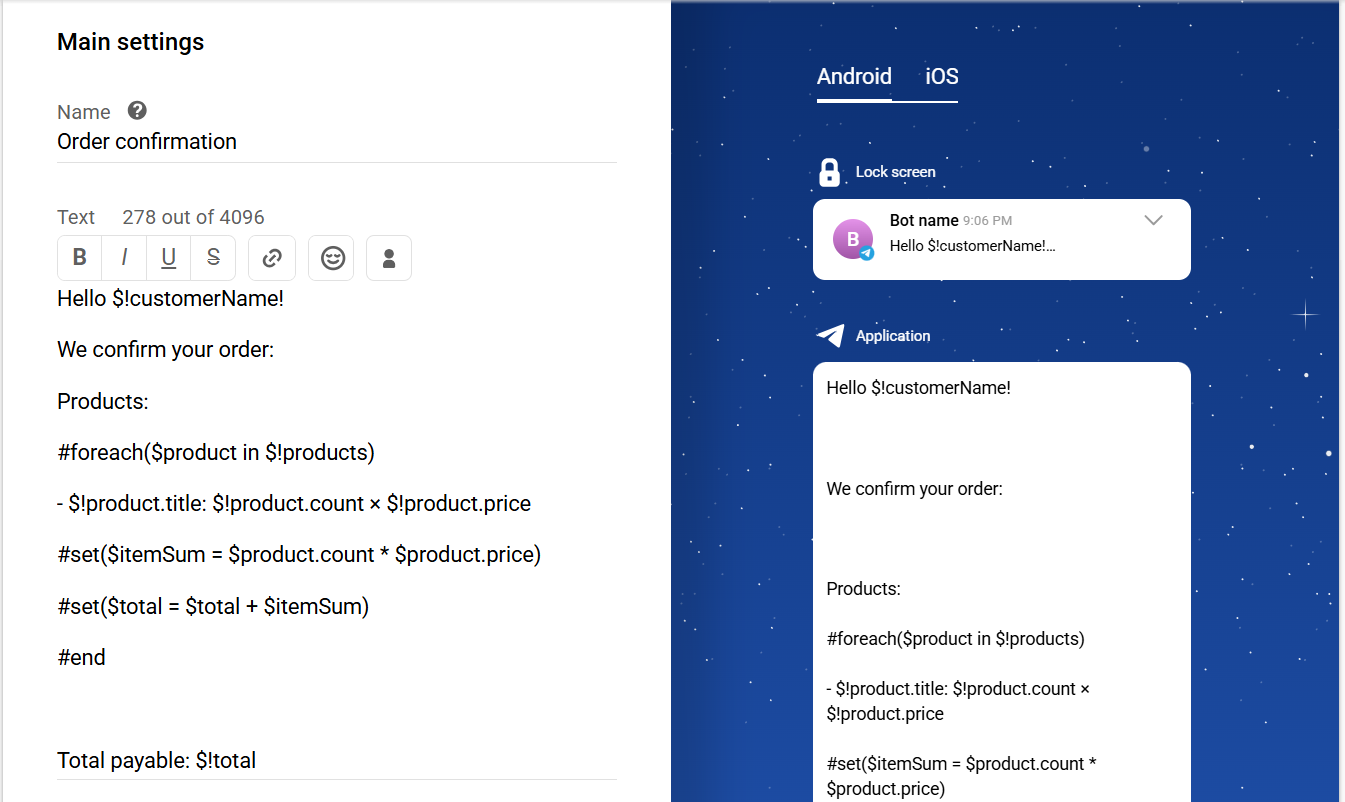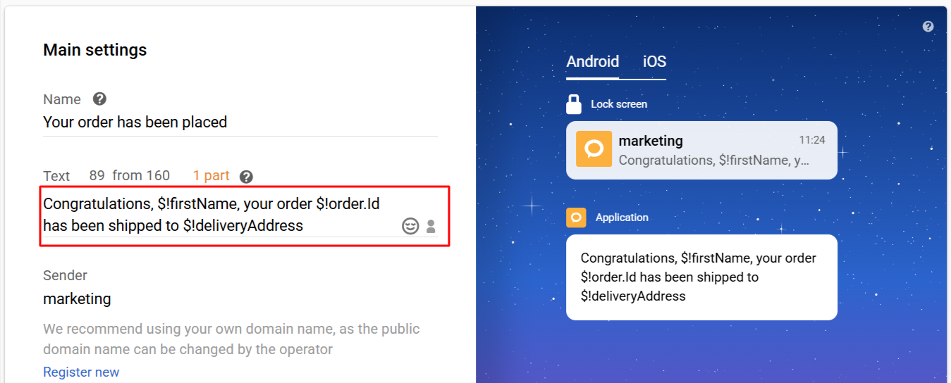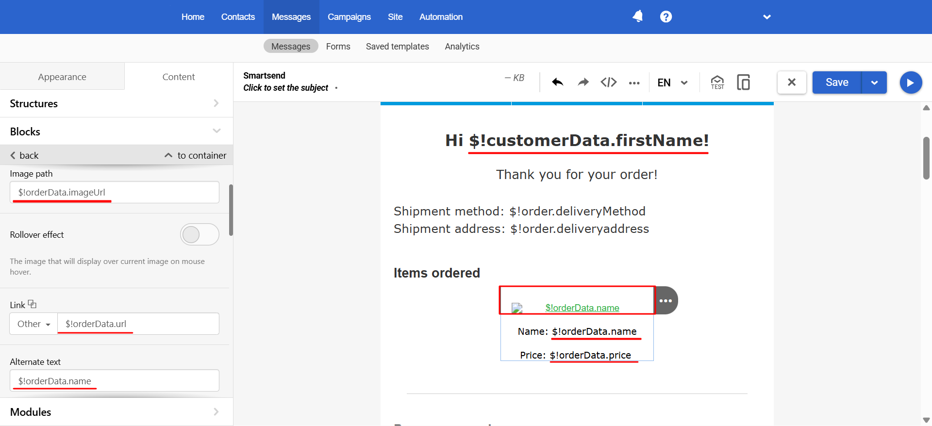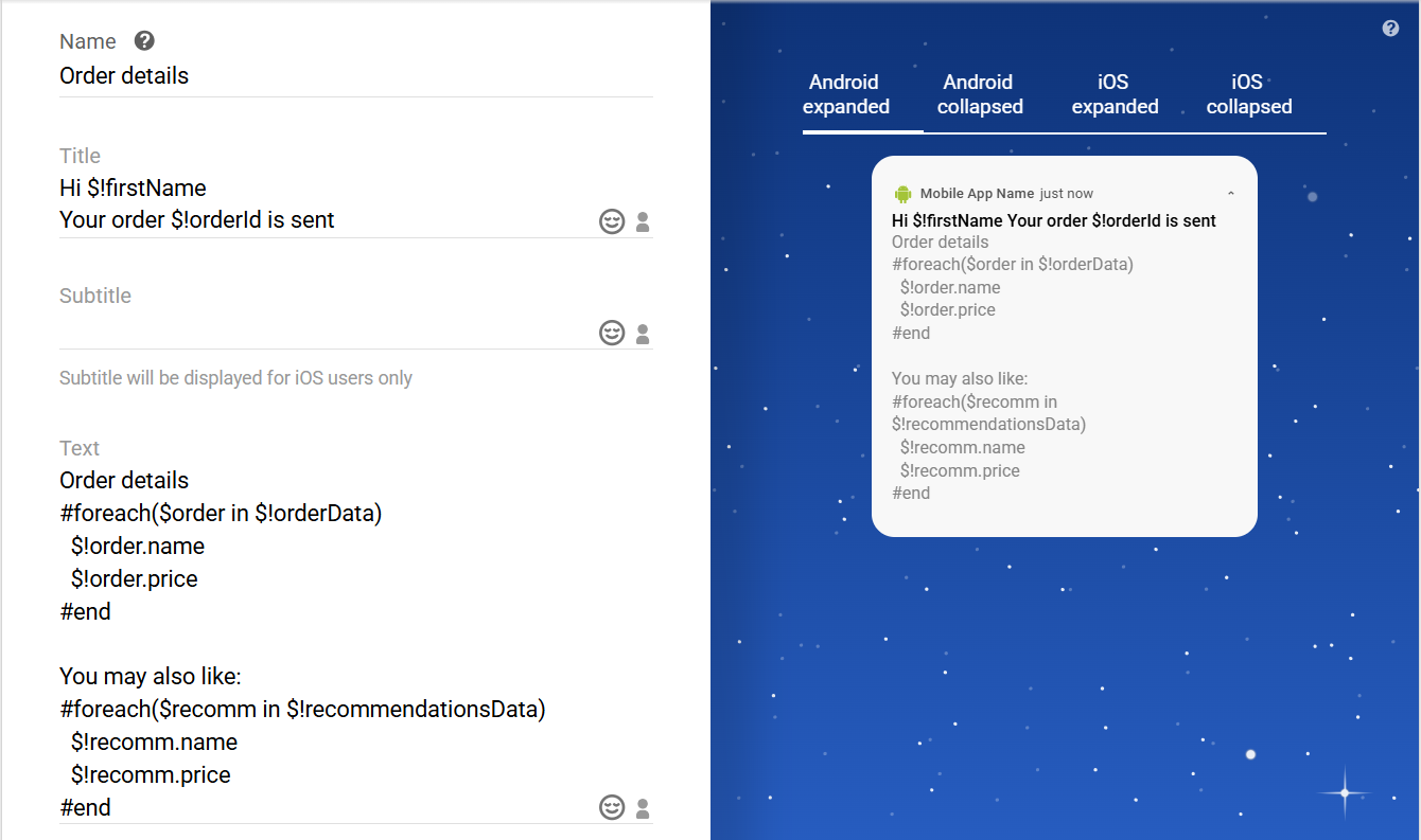 }Use variables to add dynamic content to the message: