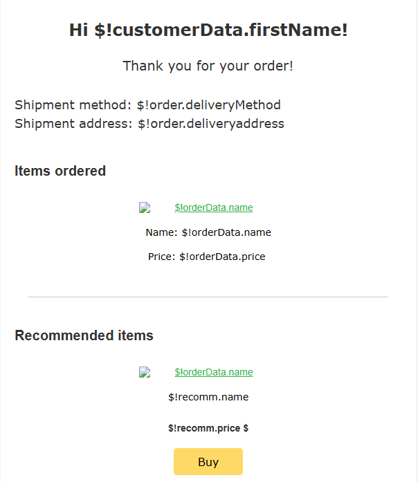 $!discount— instead of the discount size,$!link– in the button settings (link type – Other).