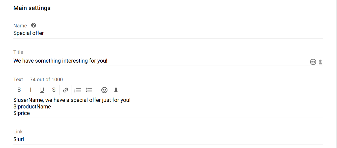 }You can insert dynamic content into a Web push notification. To do that, insert variables in the message editor in place of the logo, large image, and links: