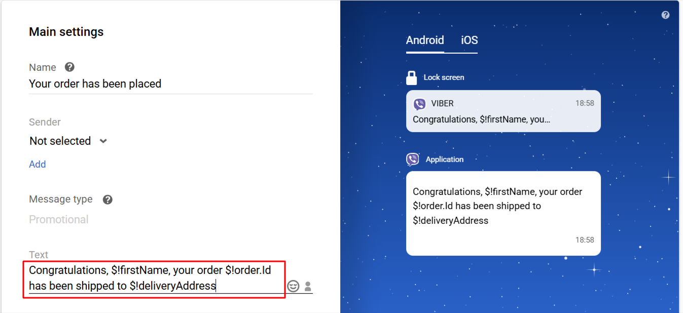 The configuration setting process is similar to the one for SMS. Define the data to be displayed in the Viber message. In contrast to SMS, a Viber message allows up to 1,000 symbols. It can display images and buttons with embedded links.