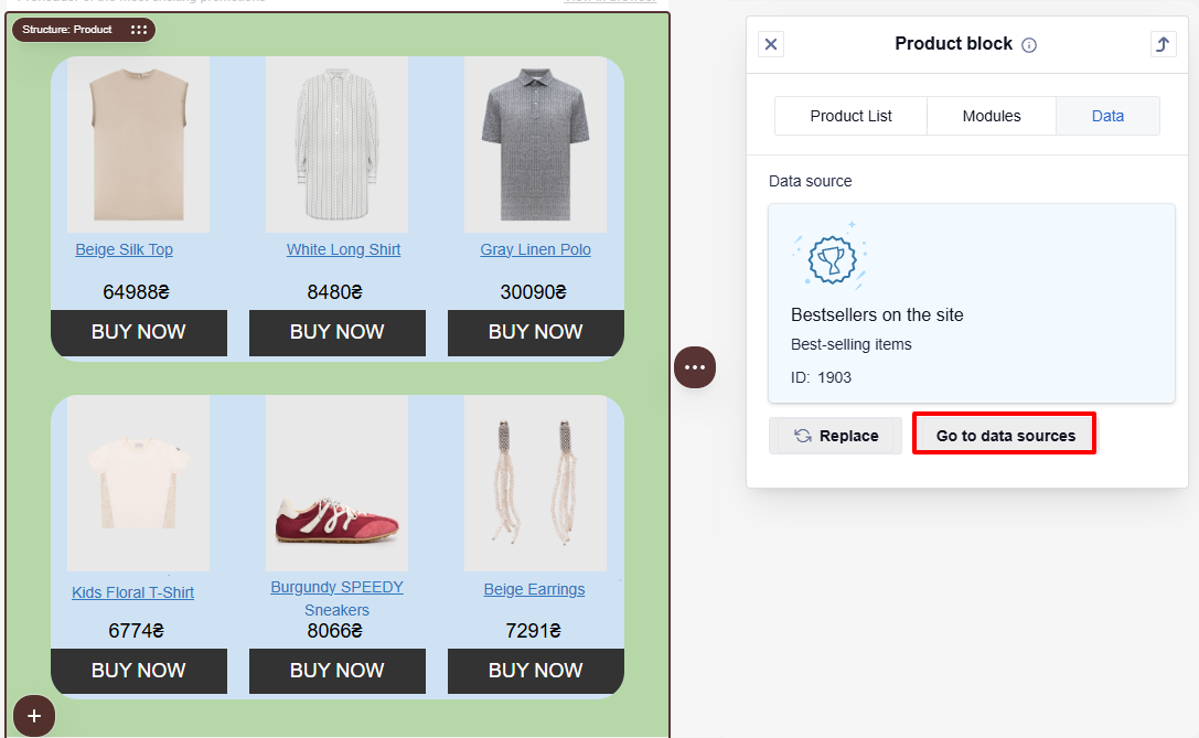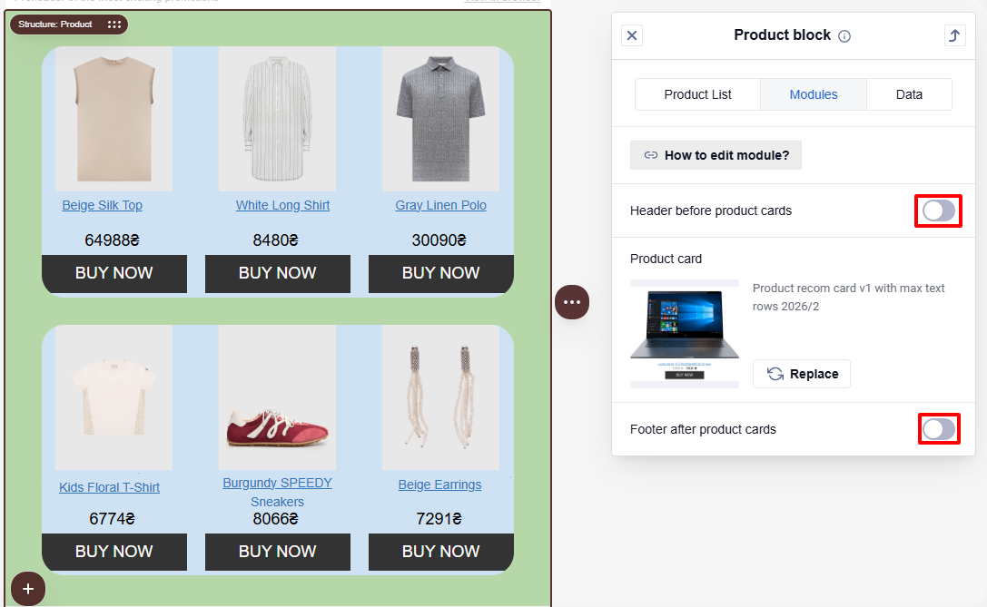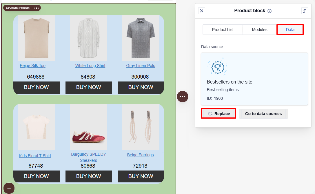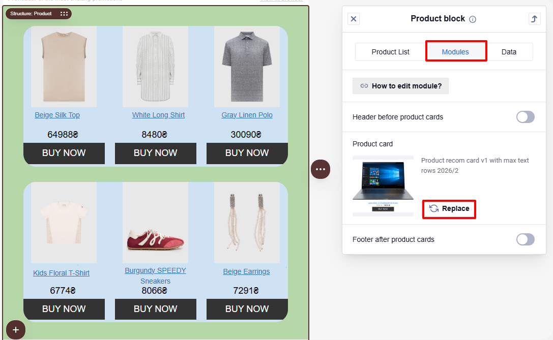 The principle for changing elements in the tab is the same. For example, let's consider replacing Product cards.