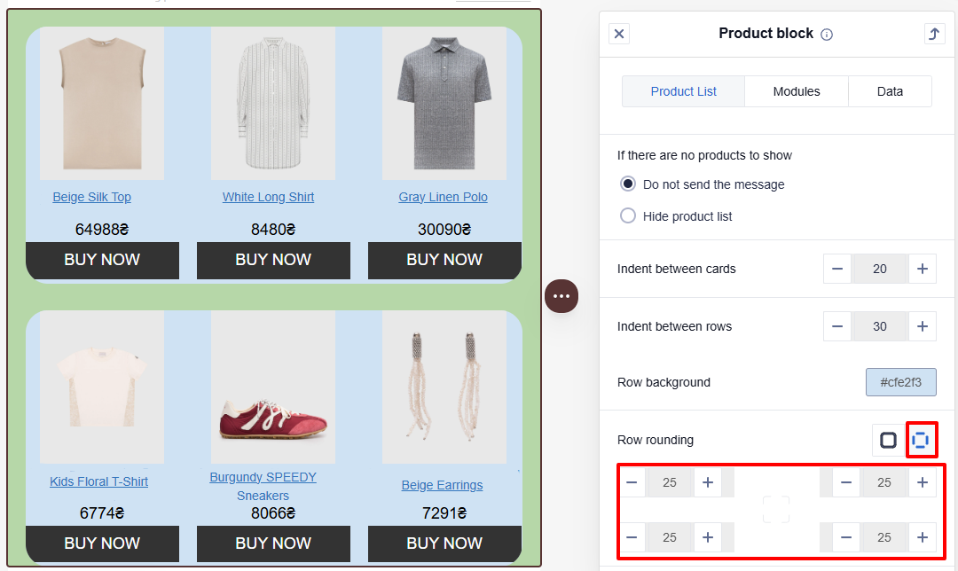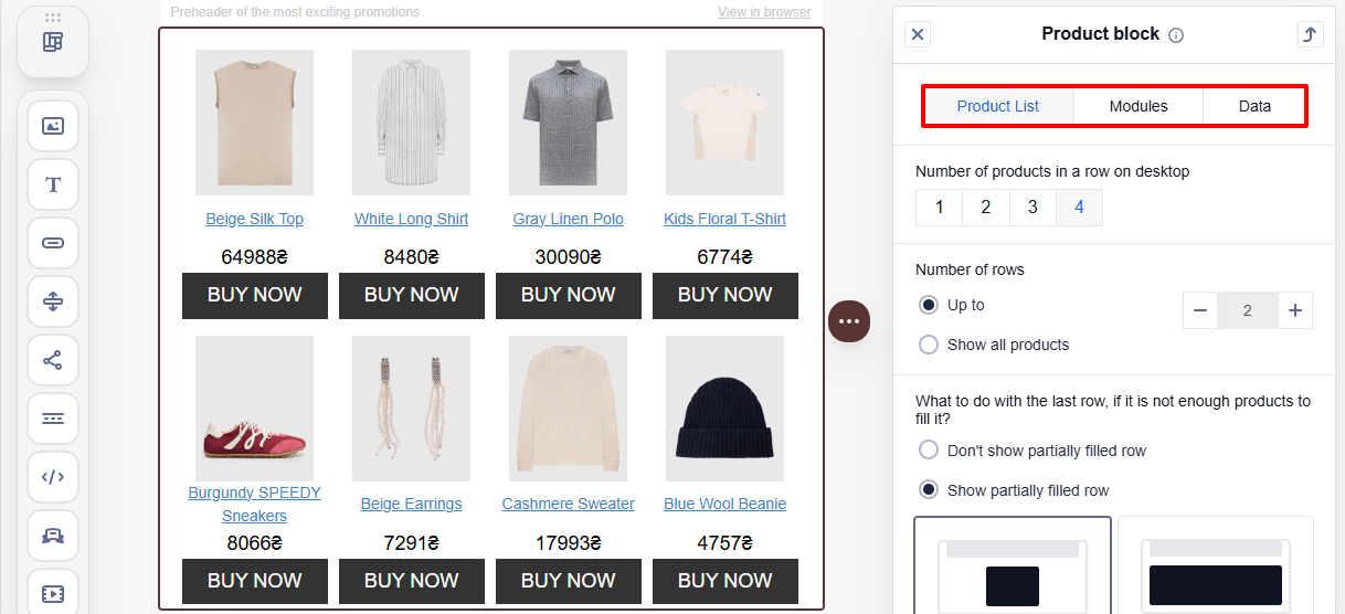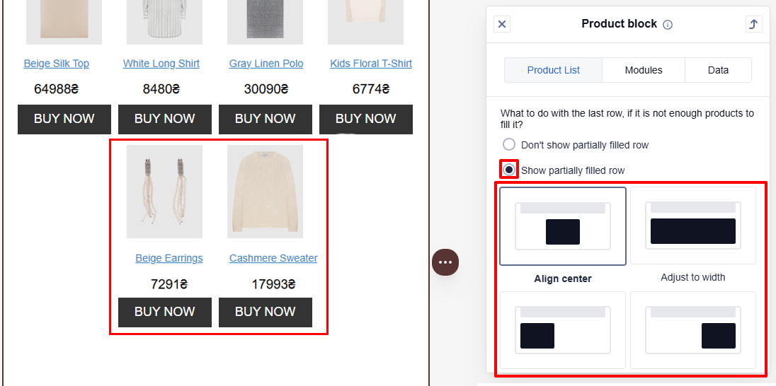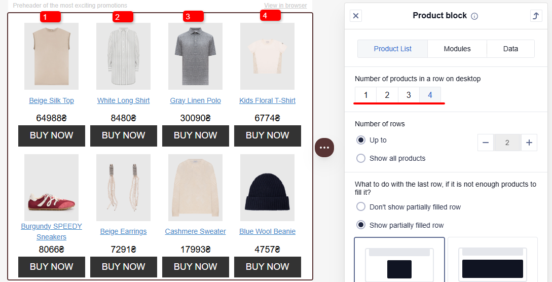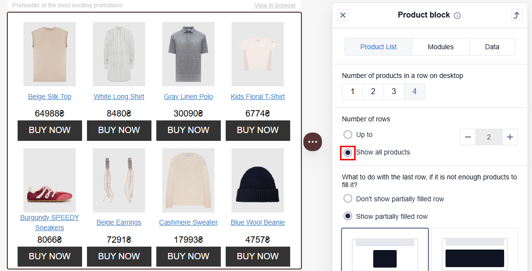 - Show partially filled row: The last row of product cards is displayed for the recipient, even if it contains fewer cards than the value you selected in the Number of products in a row section.