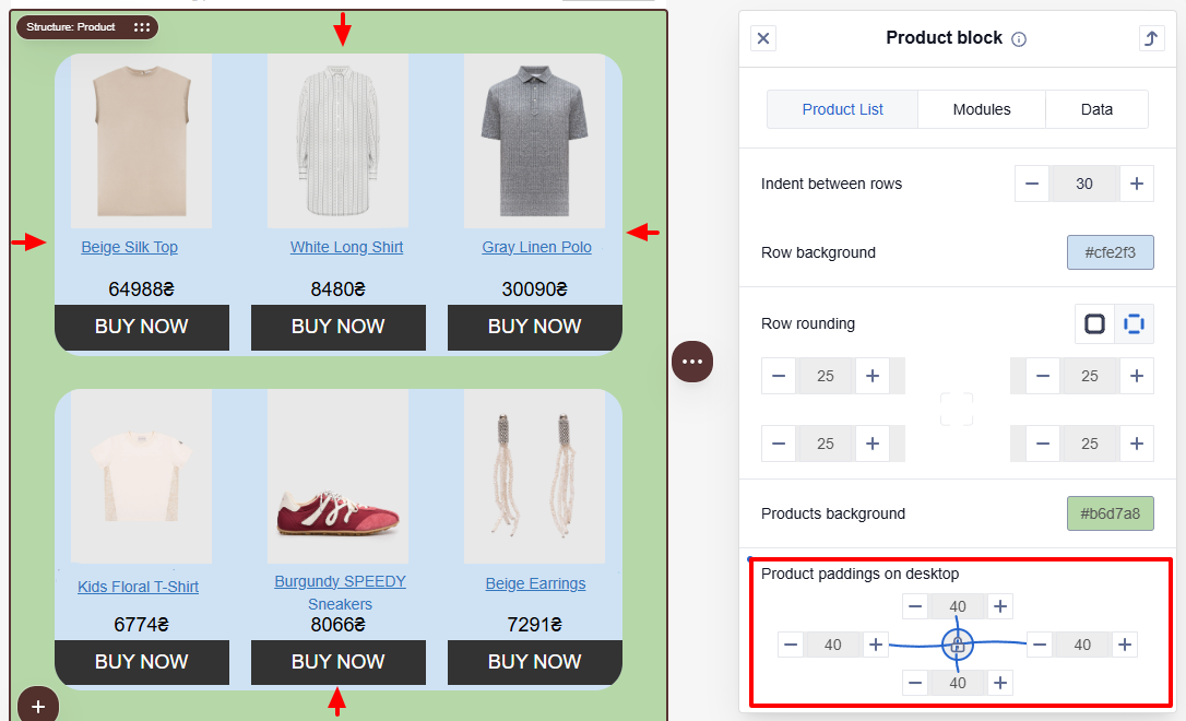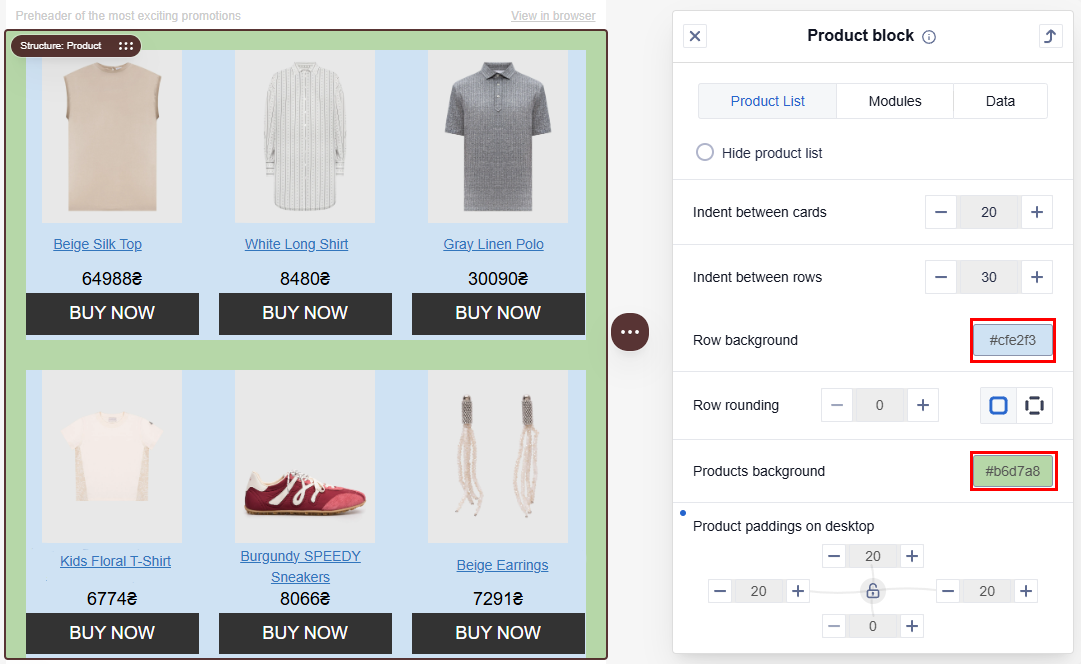 Paddings allows you to control the space around the product block. It helps separate the block from other elements in the email.
