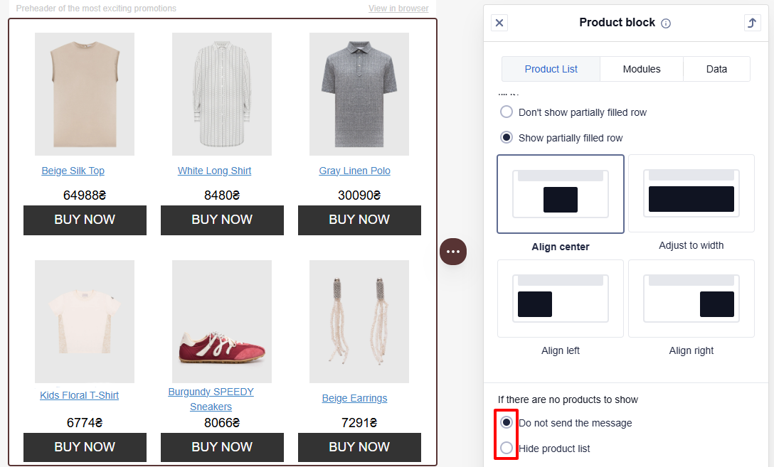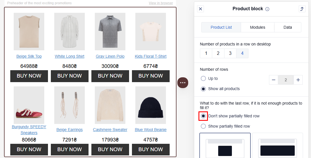 - Don't show partially filled row: If the last row of product cards contains fewer cards than the value you selected in the Number of products in a row section, then this row is not displayed for the recipient.