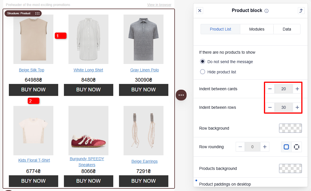 Set the indent between the cards (1) and between the rows (2) in the block. Maximum value: 40 px.