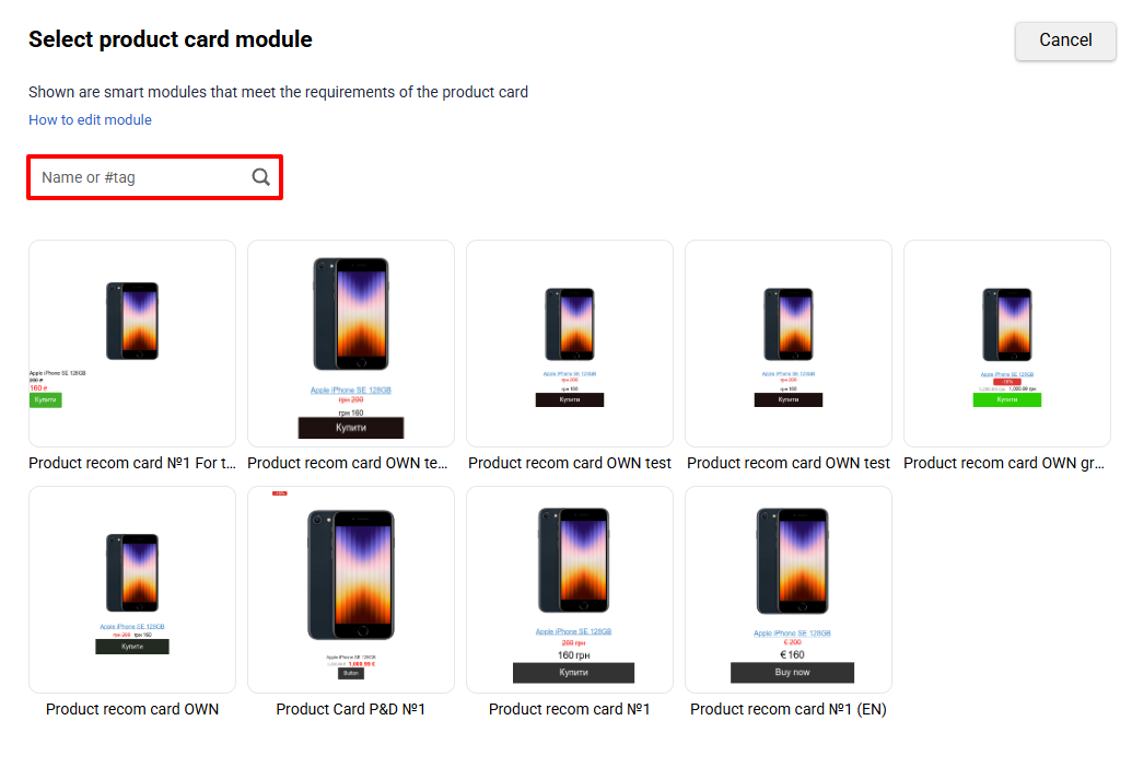 - Select a product card from the list or use the search field by name or tag.