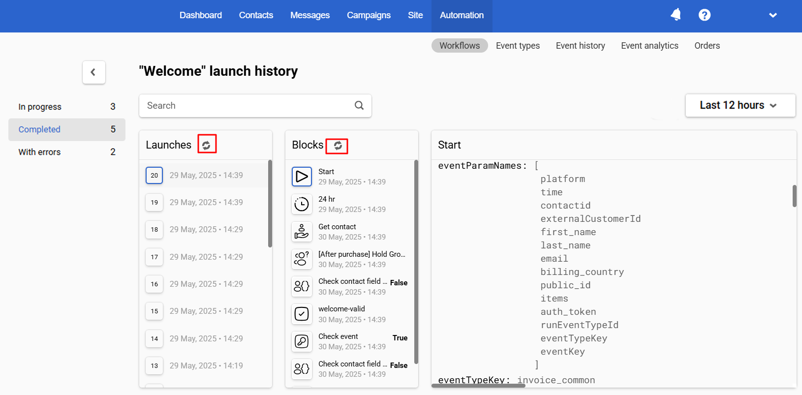 The Refresh button allows you to manually update data for launches and blocks with the In progress and Completed statuses.
