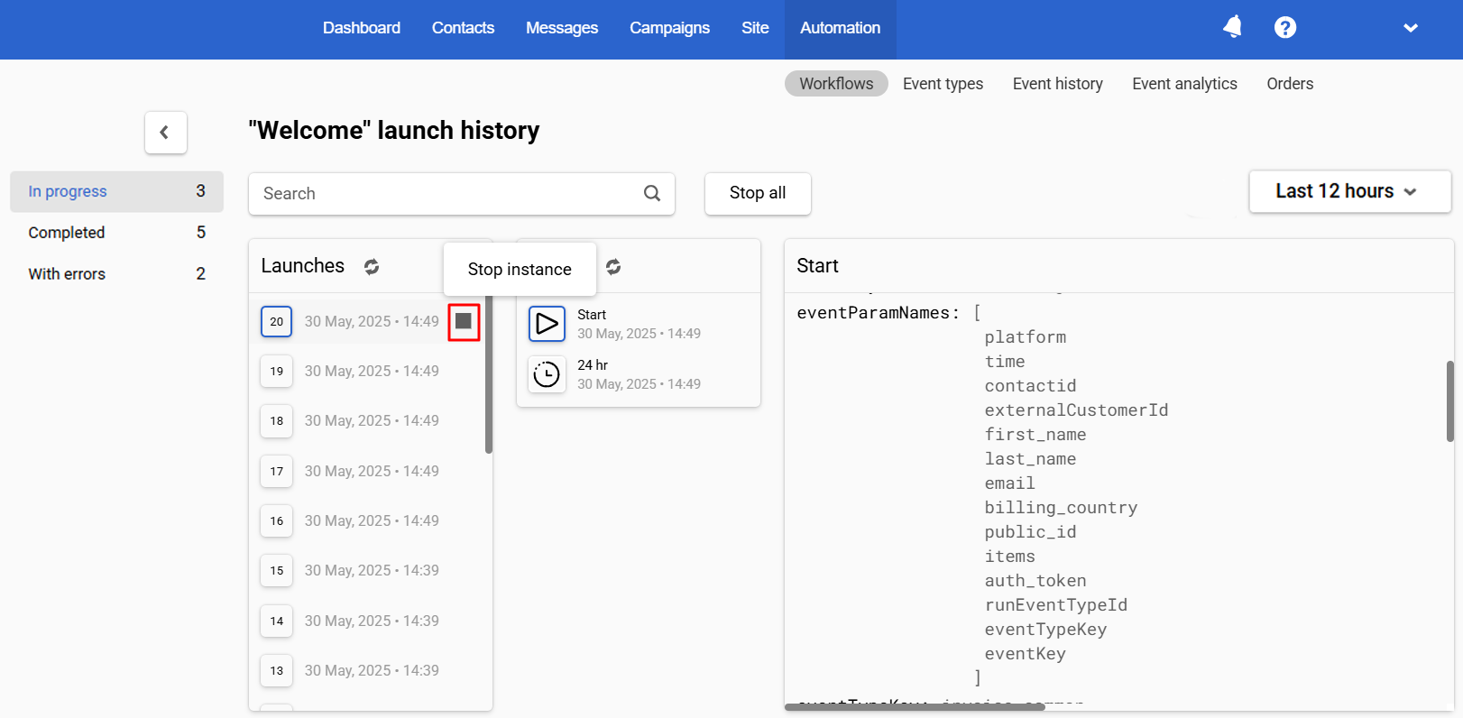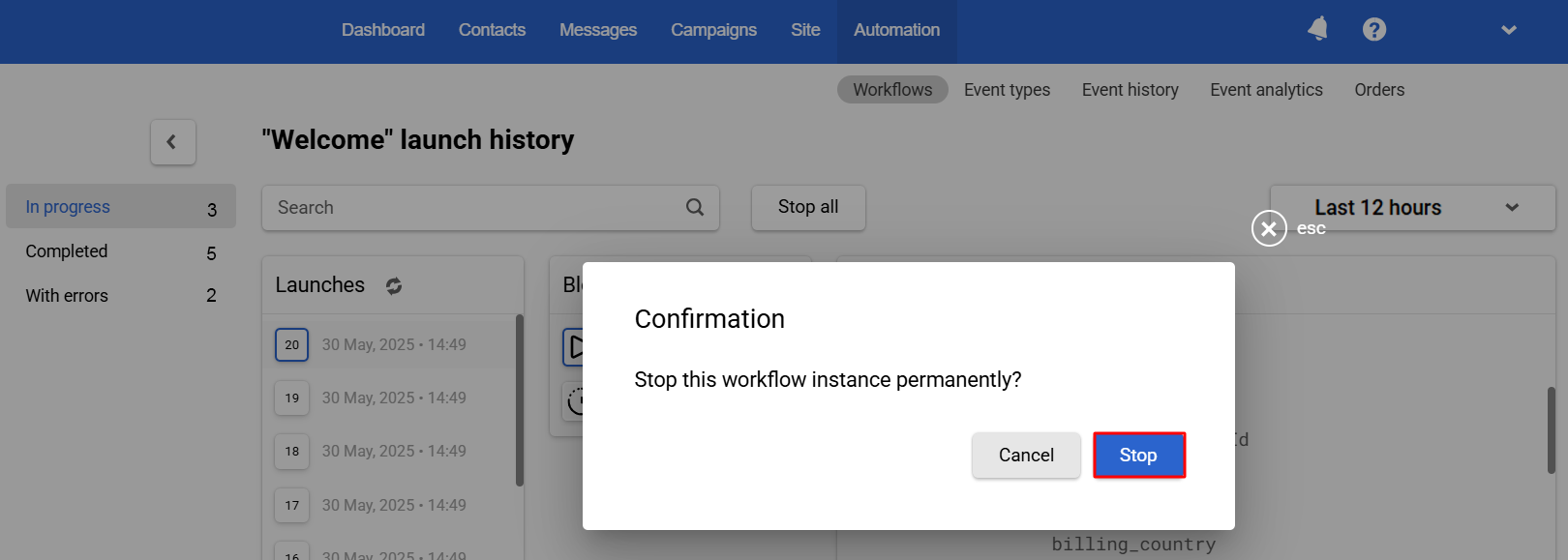 Stopping an instance of the workflow may be necessary in cases where errors have occurred, the launch is no longer relevant, changes need to be made, etc.