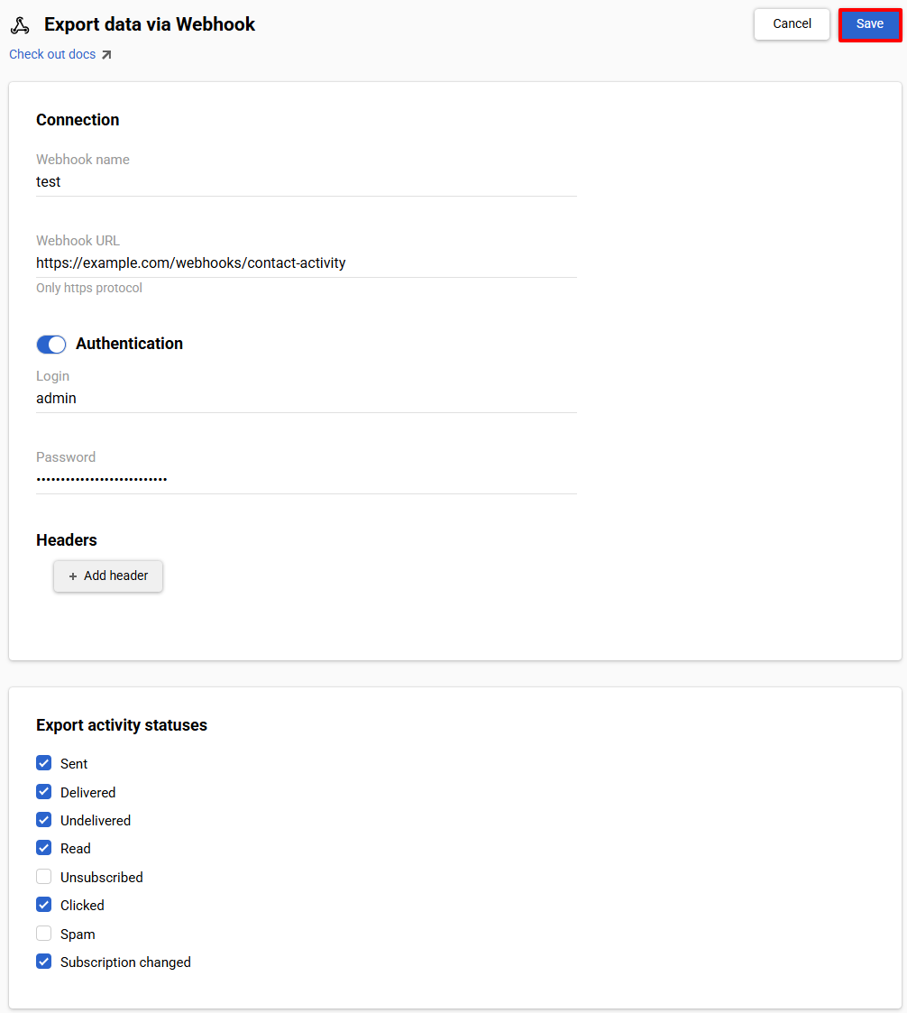 After setting up the data export via webhook, click the Save button.