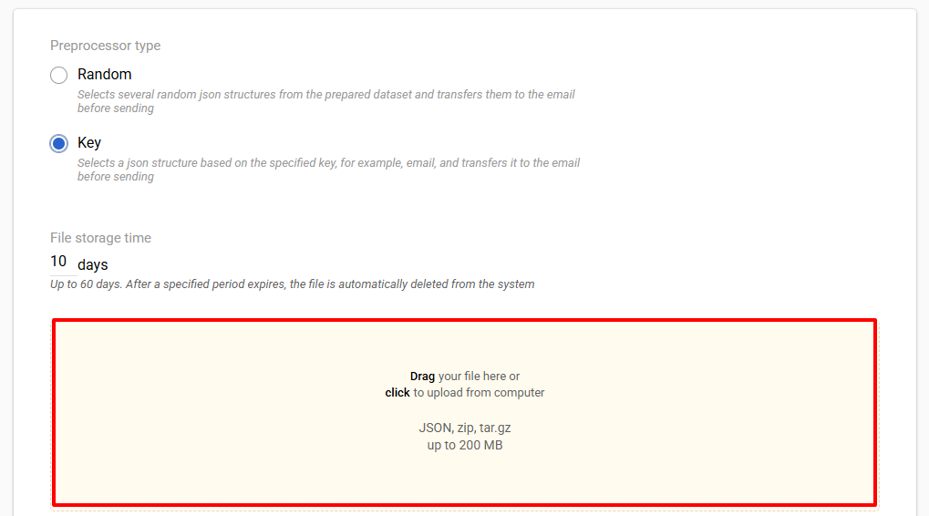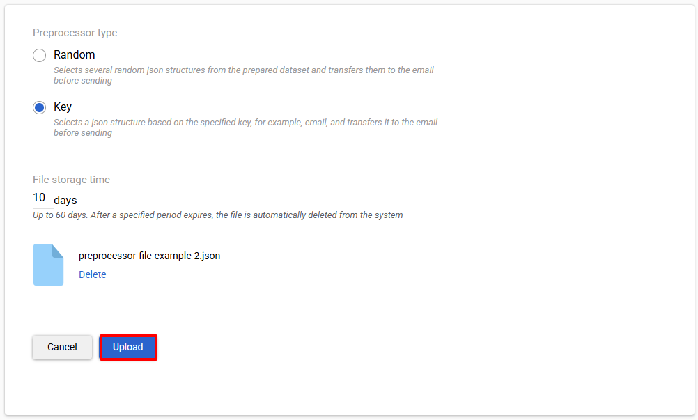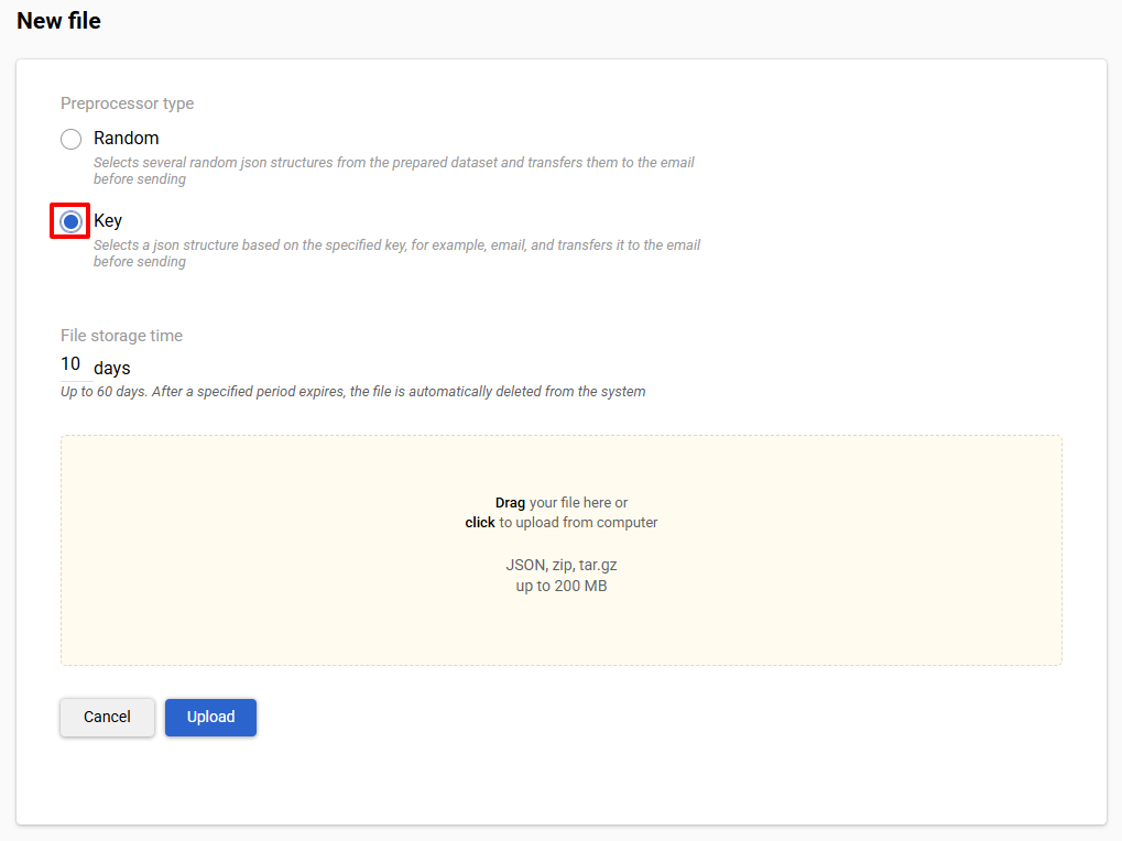- Choose preprocessor type (for example we chosen Key type, for adding file with Random type preprocessor actions will be similar).