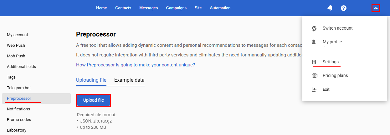 - Go to your account settings → Preprocessor tab and click Upload file.