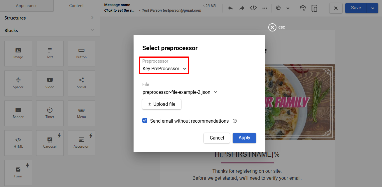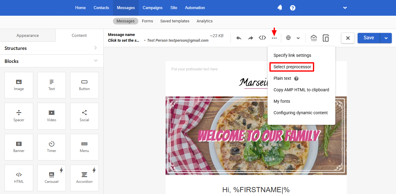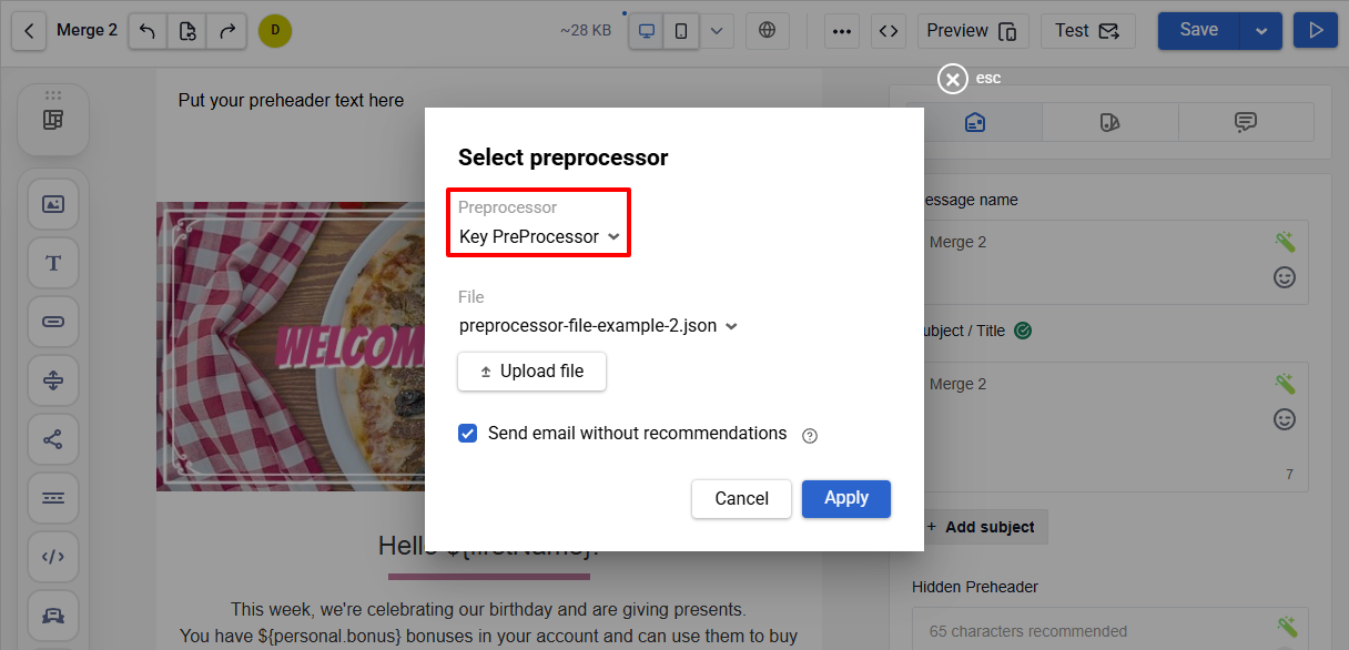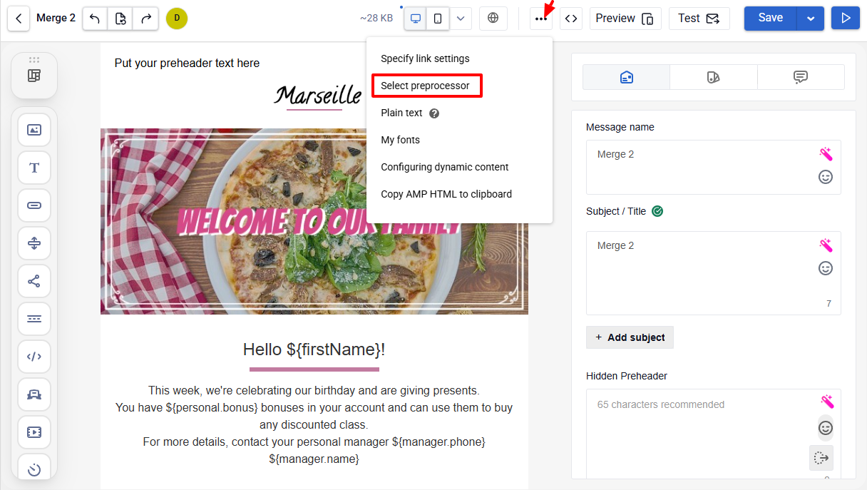 Preprocessor is a mechanism for constructing dynamic content in letters on the basis of data prepared beforehand: recommendations in letters, the mutual order of blocks, random selection of goods, and urgent offers for different user categories.