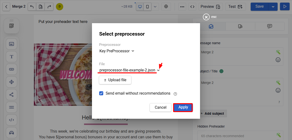 For inserting dynamic content in the message, the special template processor is used – Apache Velocity. Exactly it allows realizing conditional operators, cycles and other operations with data directly in the body of the letter. All dynamic content, available when sending, is contained in special system variable $data. After loading the file, it needs to be chosen when forming the message.