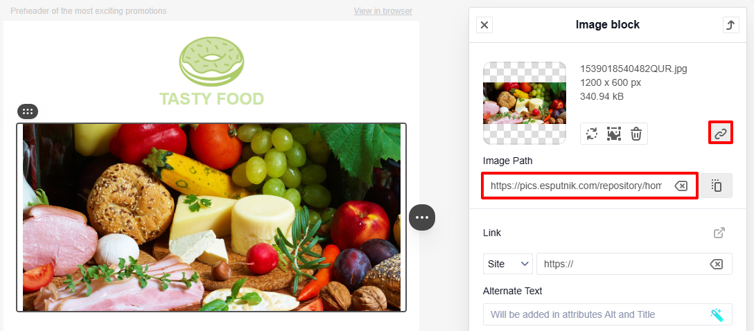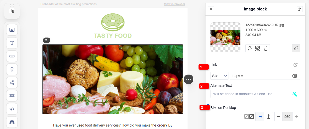 Image settings control the appearance, behavior, and additional properties of the image in the email.