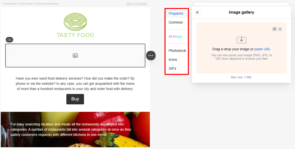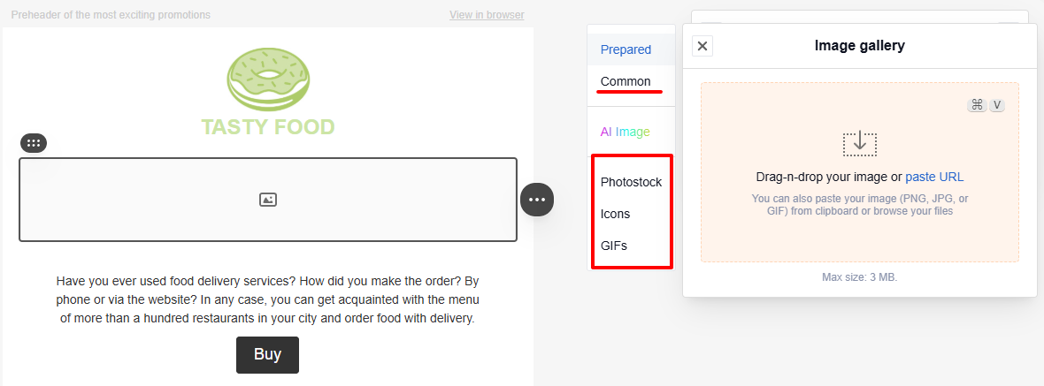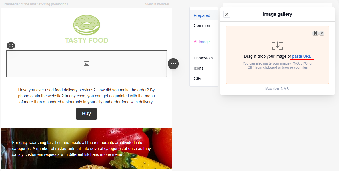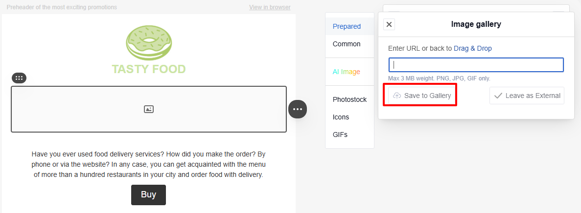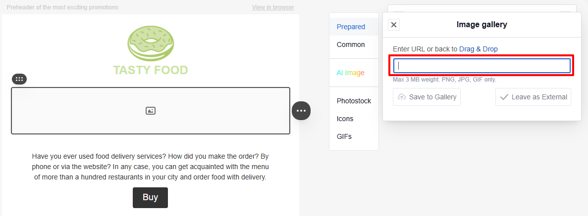 TipWhen you add an image via URL, the email relies on the external source to serve the file. If someone removes or modifies the file at that URL, the image will not appear in the email. To prevent this, save the image to the gallery.
