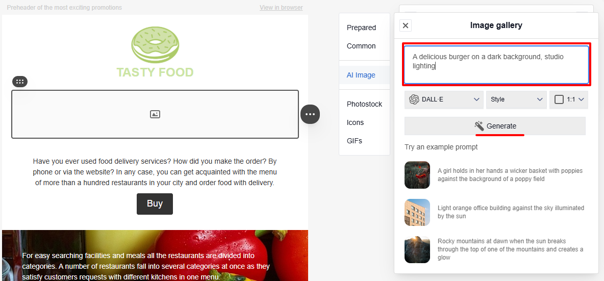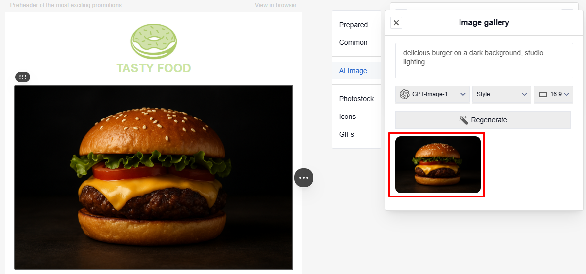 - Select the result that fits your needs and insert it into the email. If necessary, generate new images.