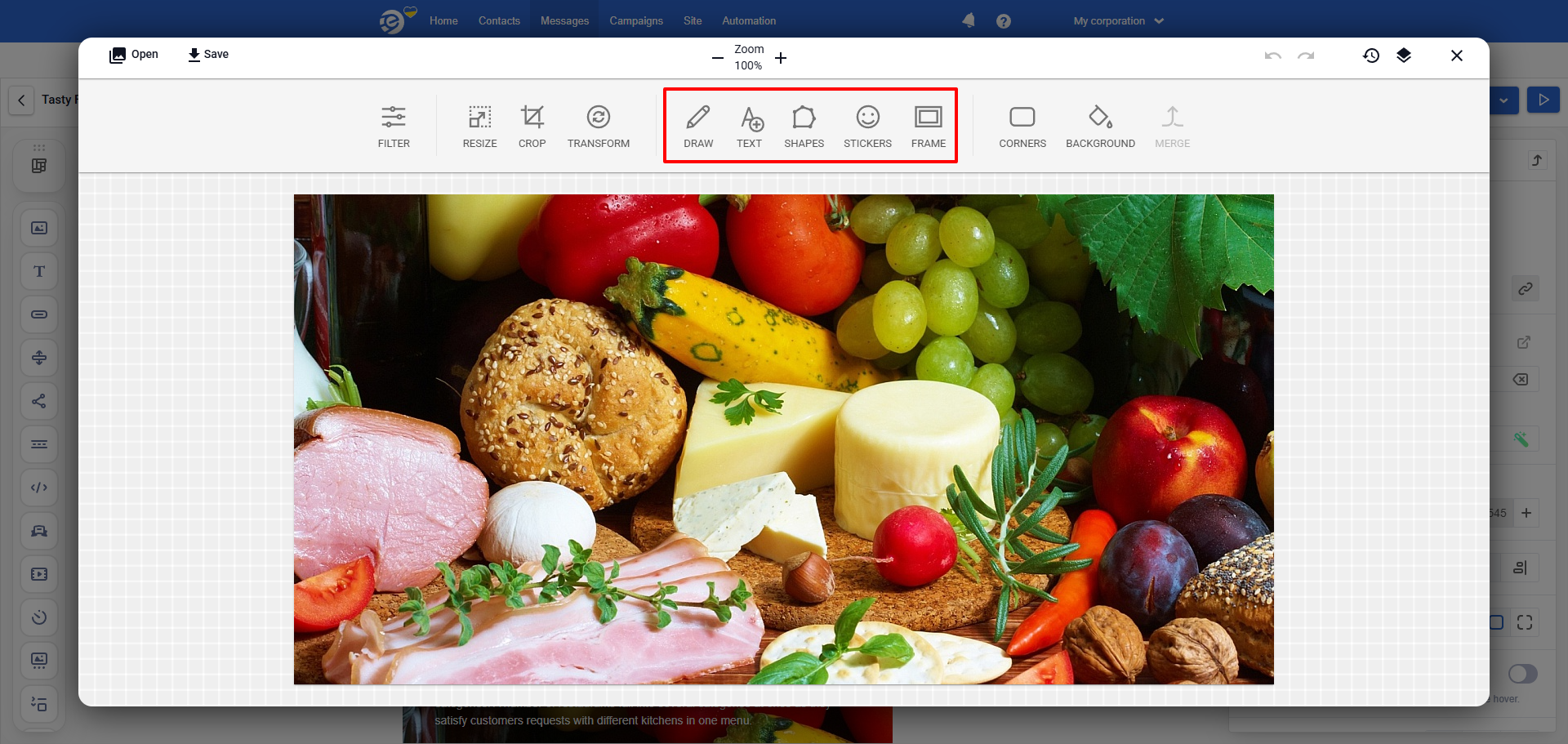 - Add elements: drawing tools, text, shapes, stickers, frames.
